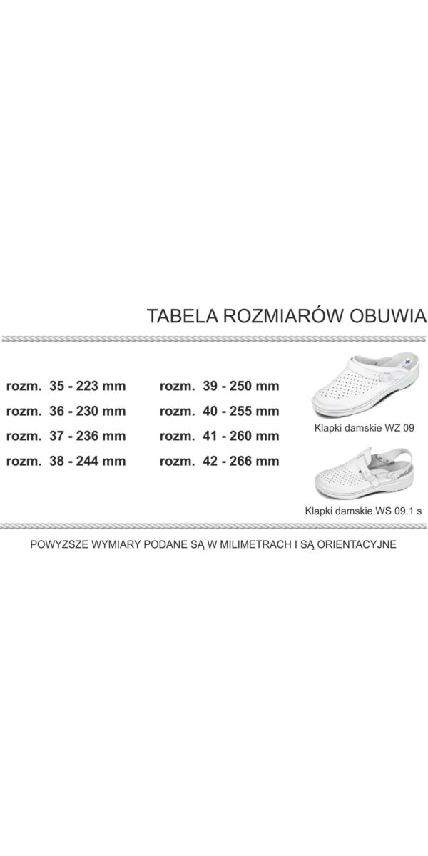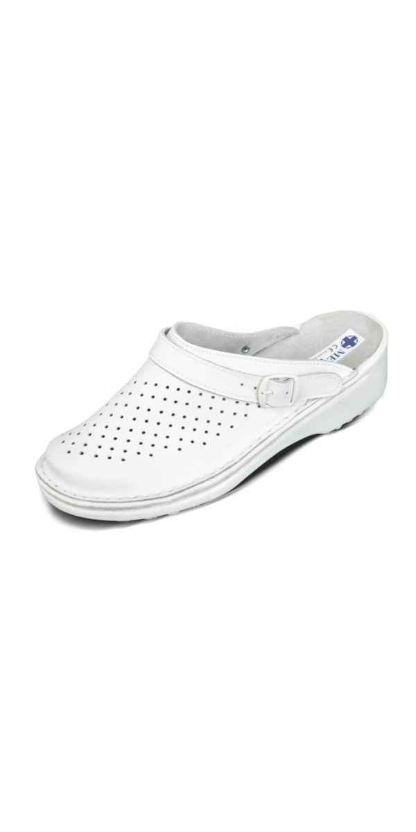 Bardzo wygodne klapki damskie. Model wykonany z gładkiej, dość delikatnej i miękkiej skóry, bardzo dobrze dopasowuje się do stopy i daje duży komfort podczas użytkowania. Buty są bardzo trwałe, z pewnością posłużą na długo. Polecane głównie kobietom, którym w pracy zależy na maksymalnej wygodzie. Spód antypoślizgowy, z lekkim pokarbowaniem, dopasowany kolorystycznie do całości. Wierzch pokryty symetrycznie rozmieszczonymi dziurkami zapewnia cyrkulację powietrza. U góry pasek ze sprzączką. Dostępne tylko w kolorze białym.