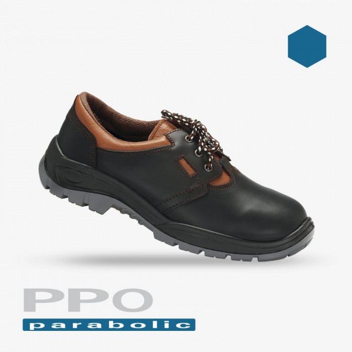 Półbuty zawodowe bez podnoska 38/ PPO spełniają normy EN 20347 (środki ochrony indywidualnej – obuwie zawodowe), O2 (obuwie zawodowe bez podnoska, zabudowana pięta, właściwości antyelektrostatyczne podeszwy, absorpcja energii w części piętowej, przepuszczalność i absorpcja wody), FO (podeszwa odporna na oleje i węglowodory), SRC (odporność na poślizg). Kolekcja PPO parabolic. Wygodne, lekkie półbuty zawodowe, klasyczny model z niską cholewką, miękkim zapiętkiem i sznurowaniem. Obuwie bez podnoska. Kolor: czarno – brązowy. Rozmiary: 39 – 48. Cholewka wykonana z licowych skór bydlęcych o zmniejszonej nasiąkliwości wody. Podszewka przyszwy z włókniny Ibiline, podszewka obłożyny z włókniny Super Royal® (materiały o dużej przepuszczalności pary wodnej, skutecznie odprowadzające wilgoć). Obuwie posiada profilowaną higroskopijną wyściółkę z filtrem aktywnego węgla o właściwościach przeciwgrzybicznych, przeciwpotnych i antybakteryjnych, co zapewnia stopie neutralny zapach, uczucie suchości i przyjemnego chłodu. Wyściółka nadaje się do wielokrotnego prania. Solidnie zaprojektowana podeszwa z dwuwarstwowego poliuretanu PU/ PU jest stabilna, dobrze urzeźbiona, antypoślizgowa, odporna na oleje, smary, benzynę i inne rozpuszczalniki organiczne, odporna na temperaturę w krótkotrwałym kontakcie do 180°C, nieprzemakalna od podłoża. Warstwa zewnętrzna (na styku z podłożem) to lity poliuretan odporny na ścieranie, przecinanie i pękanie. Warstwa wewnętrzna to spieniony poliuretan sprawiający, że obuwie jest lekkie, elastyczne i skutecznie łagodzi nierówności podłoża. Specjalnie wyprofilowany obcas chroni nogę przed skręceniem, pochłania energię w części piętowej – dwustopniowy Shockabsorber. Szczególnie polecane dla branży budowlano – remontowej, na magazyn, hale produkcyjne, do pracy w gospodarstwie.