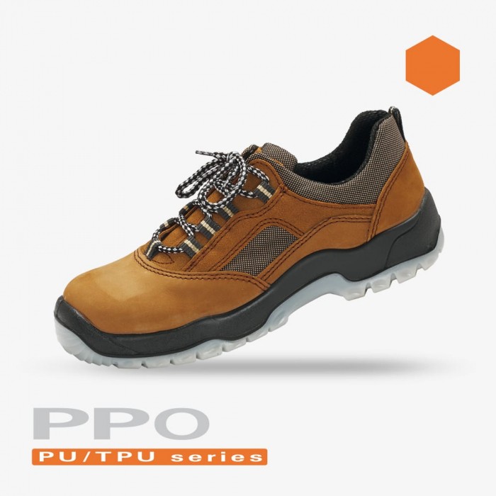 Półbuty z metalowym podnoskiem 62 N/ PPO spełnia normy EN 20345 (środki ochrony indywidualnej – obuwie bezpieczne), S1 (obuwie bezpieczne z podnoskiem kompozytowym lub metalowym), SRC (odporność na poślizg na podłożu ceramicznym pokrytym roztworem laurylosiarczanu sodu (SLS) i na podłożu ze stali pokrytym glicerolem). Kolekcja PPO PU/TPU series. Bardzo wytrzymałe, antystatyczne, antypoślizgowe półbuty robocze w kolorze czarnym, występują w rozmiarach od 39 do 47. Cholewka wykonana z jakościowej skór nubukowej i weluru o wysokim współczynniku przepuszczalności pary wodnej, 15-krotnie wyższym od wymagań normy z wstawkami z oddychającego materiału. Wewnątrz podszewka z włókniny obuwniczej o dużej przepuszczalności pary wodnej oraz odporności na ścieranie oraz wyjmowaną higroskopijną wyściółkę, która posiada bardzo dobre właściwości przeciwpotne. Absorbcja energii w części piętowej amortyzuje wstrząsy, wpływa pozytywnie na długotrwałe lub nadmierne obciążenie stopy w pozycji statycznej i dynamicznym ruchu. Dla lepszej ochrony palców obuwie zostało wyposażone w podnosek metalowy chroniący przed urazami o energii uderzenia do 200J lub naciskiem o sile 15kN. Komfort noszenia zapewnia również kołnierz i język miękko wykończony pianką eliminując tym samym uczucie ucisku. Stabilna podeszwa z PU/TPU – poliuretan termoplastyczny jest uplastycznioną formą poliuretanu, dzięki czemu łączy w sobie właściwości gumy i poliuretanu sprawiając, że obuwie nie rysuje powierzchni, ma doskonałe właściwości przeciwpoślizgowe, odporna na temperaturę w krótkotrwałym kontakcie do 120°C oraz odporna na ścieranie i przecinanie zachowując jednocześnie lekkość i elastyczność. Bieżnik z poliuretanu termoplastycznego w połączeniu z między podeszwą z spienionego poliuretanu tworzy podeszwę łączącą w sobie trwałość, funkcjonalność i komfort pracy. Urzeźbienie czubka podeszwy dodatkowo zabezpiecza przed poślizgiem przy pracach na pochyłych terenach. Bardzo designerskie półbuty w atrakcyjnej kolorystyce, mogą być stosowane w przemyśle ciężkim i lekkim. Polecane dla budowlańców, drogowców, brukarzy, magazynierów, mechaników, produkcji przy taśmie, spedycji i prac w gospodarstwie domowym.
