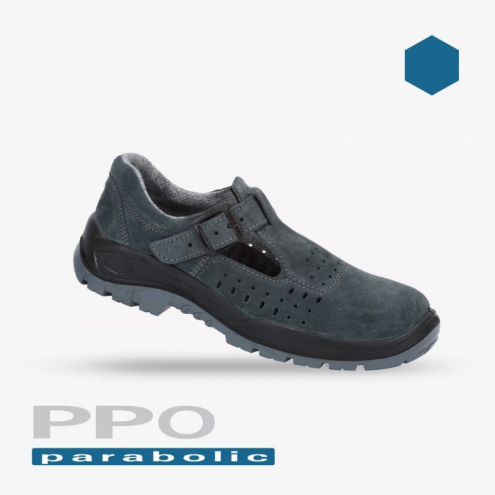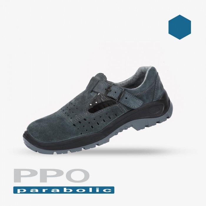 Sandały 41W z metalowym podnoskiem/ PPO spełniają normy EN 20345 (środki ochrony indywidualnej – obuwie bezpieczne). Kolekcja PPO parabolic. Bardzo wytrzymałe, antystatyczne, antypoślizgowe sandały robocze w kolorystyce szaro-niebieskiej, występują w rozmiarach od 39 do 48. Cholewka ze skóry welurowej z perforacją w części przedniej, bocznej z dużymi otworami wentylacyjnymi po bokach. Wewnątrz podszewka przyszwowa z włókniny Ibiline i obłożenie z włókniny Super Royal® są to materiały o dużej przepuszczalności pary wodnej, skutecznie odprowadzające wilgoć. Wyjmowana wyściółka miękka, wygodna, przyjazna skórze stopy, higroskopijna z filtrem aktywnego węgla o właściwościach przeciwgrzybicznych, przeciwpotnych i antybakteryjnych, co zapewnia stopie neutralny zapach, uczucie suchości i przyjemnego chłodu. Wyściółka nadaje się do wielokrotnego prania. Absorbcja energii w części piętowej amortyzuje wstrząsy, wpływa pozytywnie na długotrwałe lub nadmierne obciążenie stopy w pozycji statycznej i dynamicznym ruchu. Dla lepszej ochrony palców obuwie zostało wyposażone w podnosek metalowy chroniący przed urazami o energii uderzenia do 200J lub naciskiem o sile 15kN. Głęboki protektor i paraboliczny obcas gwarantują stabilność i komfort chodzenia. Podeszwa PU/PU z dwuwarstwowego poliuretanu odpornego na oleje, smary, benzynę i inne rozpuszczalniki organiczne. Warstwa zewnętrzna na styku z podłożem to lity poliuretan charakteryzujący się wysoką odpornością na ścieranie i przecinanie. Warstwa wewnętrzna to spieniony poliuretan sprawiający, że obuwie jest lekkie, elastyczne i skutecznie łagodzi nierówności podłoża. Obuwie nie rysuje powierzchni, ma doskonałe właściwości przeciwpoślizgowe, podeszwa odporna na temperaturę w krótkotrwałym kontakcie do 180°C. Dopasowanie za pomocą paska z klamrą , stabilizuje stopę i zapewnia bezpieczeństwo podczas chodzenia. Bardzo designerskie sandały w atrakcyjnej kolorystyce, mogą być stosowane w przemyśle ciężkim i lekkim. Polecane dla budowlańców, drogowców, brukarzy, magazynierów, mechaników, produkcji przy taśmie, spedycji i prac w gospodarstwie domowym.