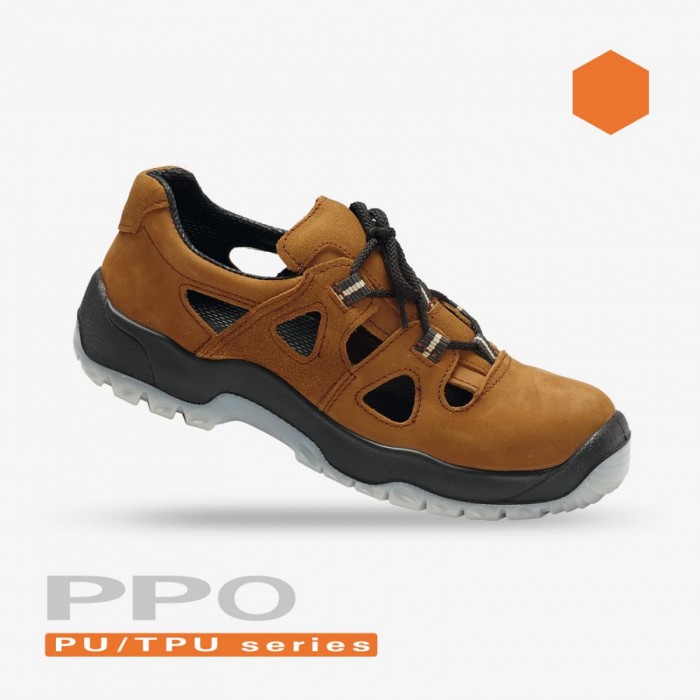 Sandały 52N/ PPO spełniają normy EN 20345 (środki ochrony indywidualnej – obuwie bezpieczne). Kolekcja PPO PU/ TPU series. Bardzo wytrzymałe, antystatyczne, antypoślizgowe sandały robocze w kolorze brązowym, występują w rozmiarach od 39 do 47. Cholewka ze skóry nubukowej i skóry welurowej z dużymi otworami wentylacyjnymi po bokach. Wewnątrz podszewka z włókniny obuwniczej o dużej przepuszczalności pary wodnej oraz odporności na ścieranie oraz wyjmowaną higroskopijną wyściółkę