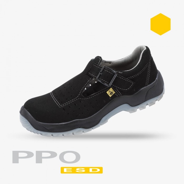 Sandały z metalowym podnoskiem ESD SRC 601/ PPO spełniają normy EN 20345 (środki ochrony indywidualnej – obuwie bezpieczne), S1 (obuwie bezpieczne z podnoskiem kompozytowym lub metalowym), ESD (ochrona przed ryzykiem wyładowań statycznych pracownika), SRC (odporność na poślizg na podłożu ceramicznym pokrytym roztworem laurylosiarczanu sodu (SLS) i na podłożu ze stali pokrytym glicerolem). Kolekcja PPO ESD. Komfortowe obuwie bezpieczne, lekkie i wygodne. Obuwie antyelektrostatyczne. Chroni przed efektem ESD zgodnie z normą PN-EN 61340-5-1:2017-01, posiada właściwości rozpraszające. Kolor: czarny. Rozmiar: 39 – 48. Model z niską cholewką, miękkim wykończeniem obszaru pięty i kostki, dopasowanie za pomocą paska z klamrą. Cholewka perforowana z dużymi otworami wentylacyjnymi. Wykonana z miękkiej, przyjaznej skórze, zaawansowanej technicznie mikrofibry o strukturze weluru, która cechuje się wysoką oddychalnością i odpornością na ścieranie. Antybakteryjna podszewka z materiału Coolmax® posiada doskonałe właściwości higieniczne. Skutecznie odprowadza wilgoć i szybko odparowuje, neutralizuje nieprzyjemne zapachy, znacząco podnosi komfort użytkowania. Obuwie wyposażono w metalowy podnosek zabezpieczający palce przed uderzeniami z siłą 200J. Higroskopijna wyściółka z filtrem aktywnego węgla jest miękka, wygodna, przyjazna skórze, ma właściwości przeciwgrzybiczne, przeciwpotne, antybakteryjne, zapewnia stopie neutralny zapach, uczucie suchości i przyjemnego chłodu. Stabilna dwuwarstwowa podeszwa z PU/TPU (bieżnik z litego, transparentnego poliuretanu termoplastycznego, międzypodeszwa ze spienionego poliuretanu komórkowego). Podeszwa jest olejoodporna, antypoślizgowa, pochłania energię w części piętowej, lekka, elastyczna i wytrzymała. Półbuty sprawdzą się w branży elektronicznej, komputerowej, chemicznej, samochodowej, farmaceutycznej, medycznej, w przemyśle spożywczym, lotniczym, w laboratoriach, biotechnologii.