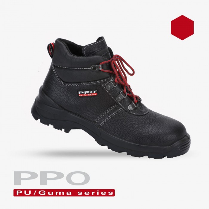 Trzewiki bezpieczne z podnoskiem i wkładką antyprzebiciową 0373/ PPO spełniają normy EN 20345 (środki ochrony indywidualnej – obuwie bezpieczne), S3 (podnosek odporny na uderzenia z siłą 200J, zabudowana pięta, właściwości antyelektrostatyczne, absorpcja energii w części piętowej, odporność na przebicie z siłą 1100N oraz urzeźbienie podeszwy, nieprzepuszczalność wody), HRO (odporność spodów na kontakt z gorącym podłożem, 300°C przez 1 minutę), SRC (podeszwa zewnętrzna odporna na poślizg na podłodze ceramicznej lub stalowej z rozcieńczonym roztworem mydła lub gliceryną). Kolekcja PPO PU/ Guma series. Wygodne trzewiki robocze do trudnych warunków pracy. Obuwie antyelektrostatyczne. Kolor: czarny. Rozmiar: 39 – 48. Model z wysoką cholewką za kostkę, zakończoną kołnierzem ochronnym, wypełnionym pianką lateksową, półmiechowym językiem skórzanym, dopasowaniem za pomocą ściągania sznurówkami. Cholewka wykonana ze skóry licowej tłoczonej o zmniejszonej nasiąkliwości wody. Podszewka przyszwy: tkanina Ibiline, podszewka obłożyny: materiał Super Royal® o dużej przepuszczalności pary wodnej. Trzewiki posiadają wyjmowaną wyściółkę o wysokiej higroskopijności. Dla pełnego bezpieczeństwa obuwie wyposażono w metalowy podnosek odporny na uderzenia z siłą 200J oraz metalową wkładkę antyprzebiciową chroniącą przed przekłuciem od podłoża z siłą do 1100N. Trzewiki posiadają dwuwarstwową podeszwę PU/Guma, nieprzemakalną od podłoża, odporną na oleje, benzynę, inne rozpuszczalniki organiczne, odpornością na ścieranie i przecinanie, rozcieńczone roztwory kwasów i zasad (30% H2SO4 i 20% NaOH) oraz temperaturę w krótkotrwałym kontakcie do 300°C. Warstwa wewnętrzna to spieniony poliuretan sprawiający, że obuwie jest lekkie, elastyczne i skutecznie łagodzi nierówności podłoża. Podeszwa skutecznie chroni przed poślizgiem na podłożu stalowym i ceramicznym. Pochłania energię w części piętowej, niweluje wstrząsy podczas chodzenia. Specjalnie wyprofilowany obcas dodatkowo chroni nogę przed skręceniem. Trzewiki cechuje trwałość i wytrzymałość, sprawdzą się w ciężkich warunkach pracy. Polecane dla branży budowlano – remontowej, montażowej, na magazynie, w warsztacie.